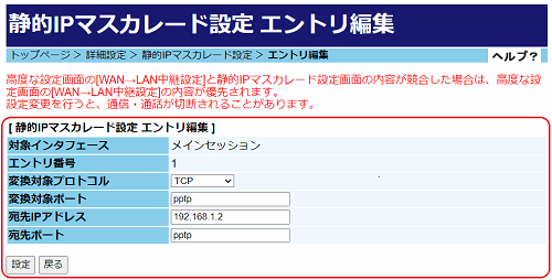 LAN側のPPTPサーバへWAN側のPPTPクライアントからアクセスする場合は、本商品へ静的IPマスカレード設定が必要です。