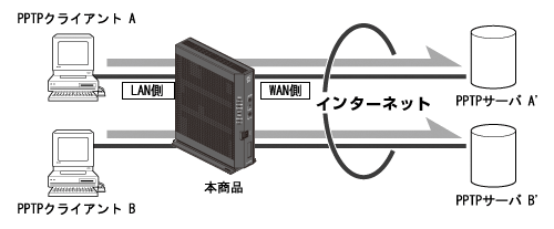 本商品に接続したPPTPクライアントからそれぞれ別のPPTPサーバに接続する
