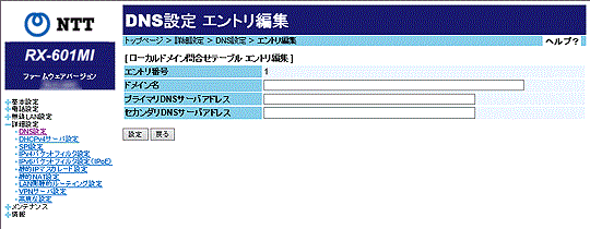 ローカルドメインの問合せテーブルの設定をする場合は、下欄の[編集]をクリックすると「エントリ編集」の画面が表示されます。